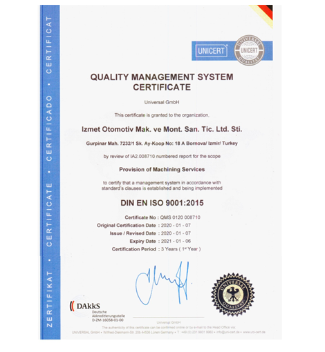Izmet has ISO 9001:2015 quality system certification. He started to get ISO TS 16949 QMS certification in 2020. Main focus in Izmet is continuous improvement of the processes in manufacturing metal products for automotive industry and machine industry: Better better and better for productivity, effiency and preventing defects. Our personnels are aware of VDA 6.3 main points, process indicators and targets by PPAP, FMEA, Control Plan, SPC, IMDS for raw material and the first/final control applications. We have implemented a process which motivates the staff by our motto: OUR AIM IS TO CONTINUE WİTHOUT STOPPING TO ACHIEVE PERFECTION, OF COURSE, TO GIVE THE BEST PRICE FOR OUR CUSTOMER AS OUR PARTNER.